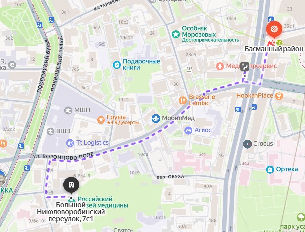Двигаемся пешком вверх по ул. Воронцово Поле (10 мин). Доходим до пересечения с Большим Николоворобинским переулком и поворачиваем налево (угол здания посольства Индии).